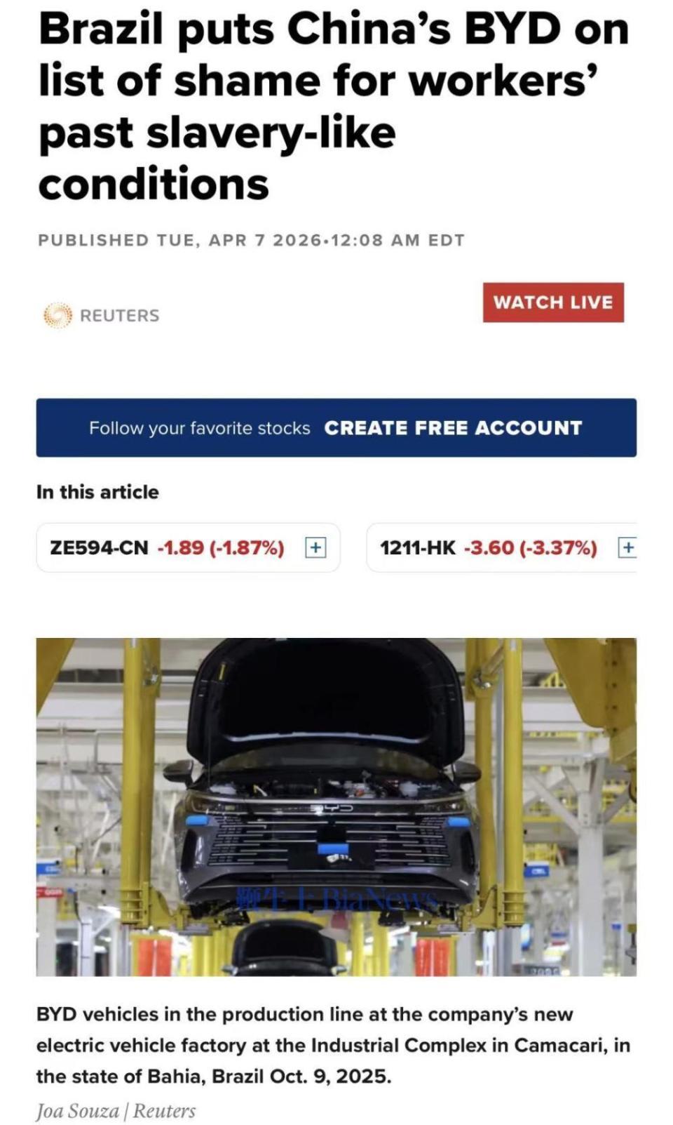 据外电报道,巴西已将比亚迪列入存在“类似奴役劳动”用工行为的企业登记名单(俗称“耻辱名单”)。此前2024年曝出相关丑闻,涉事中国劳工被指遭遇人口贩卖及苛待性合同。