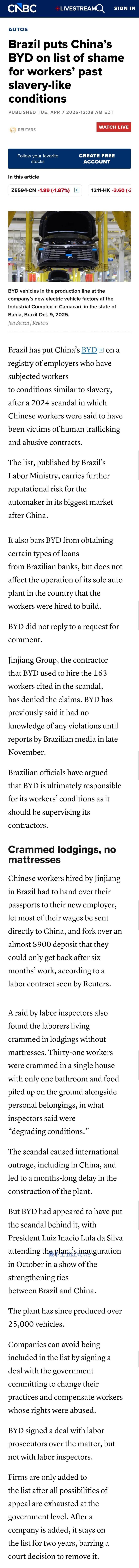 该认定同时导致比亚迪无法从巴西银行获取部分类型贷款,但不会影响其在巴西唯一整车工厂的运营——涉事劳工正是受雇参与该工厂建设。