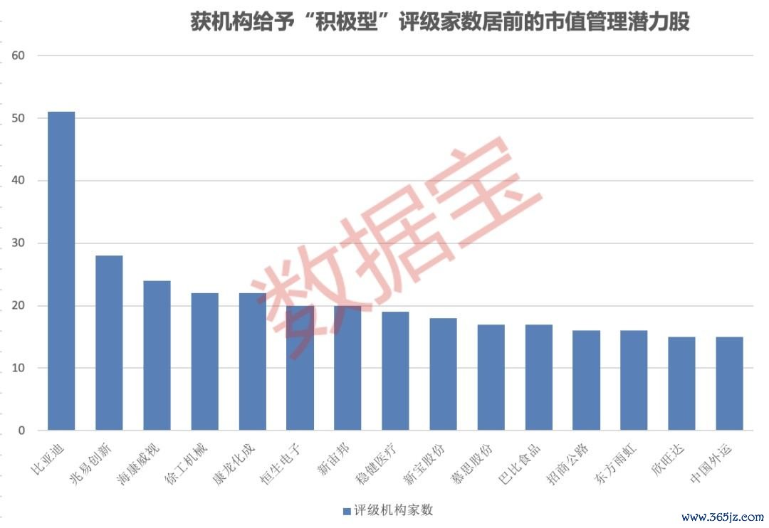 据数据宝统计,50只市值管理潜力股中,有40只个股获5家以上机构积极型评级(买入和增持评级)。