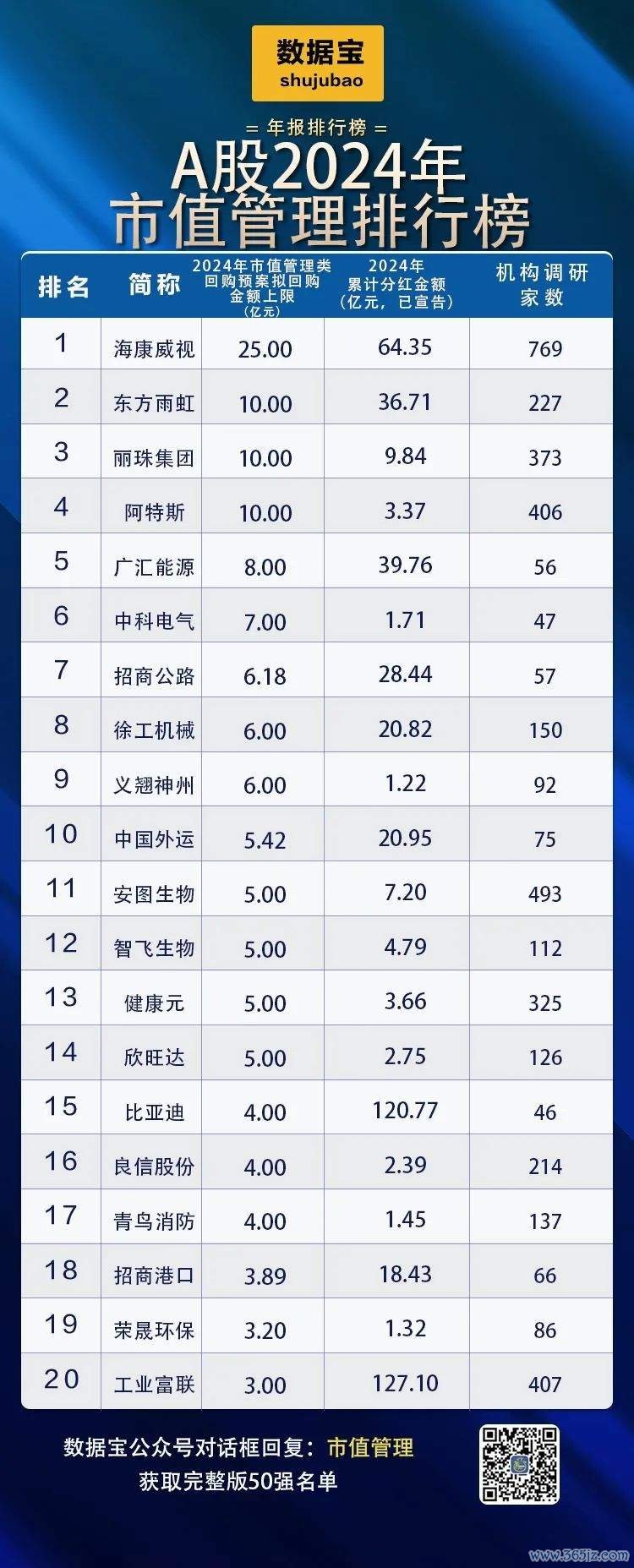 基于上述分析,数据宝在2024年盈利超1亿元的A股公司中,按2024年(统计口径为预案日)发布的市值管理类回购预案公告回购金额上限超5000万元、2024年累计分红金额(已宣告)超1亿元、2024年机构调研家数超40家三个条件进行筛选,50只市值管理潜力股浮出水面。